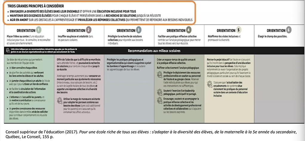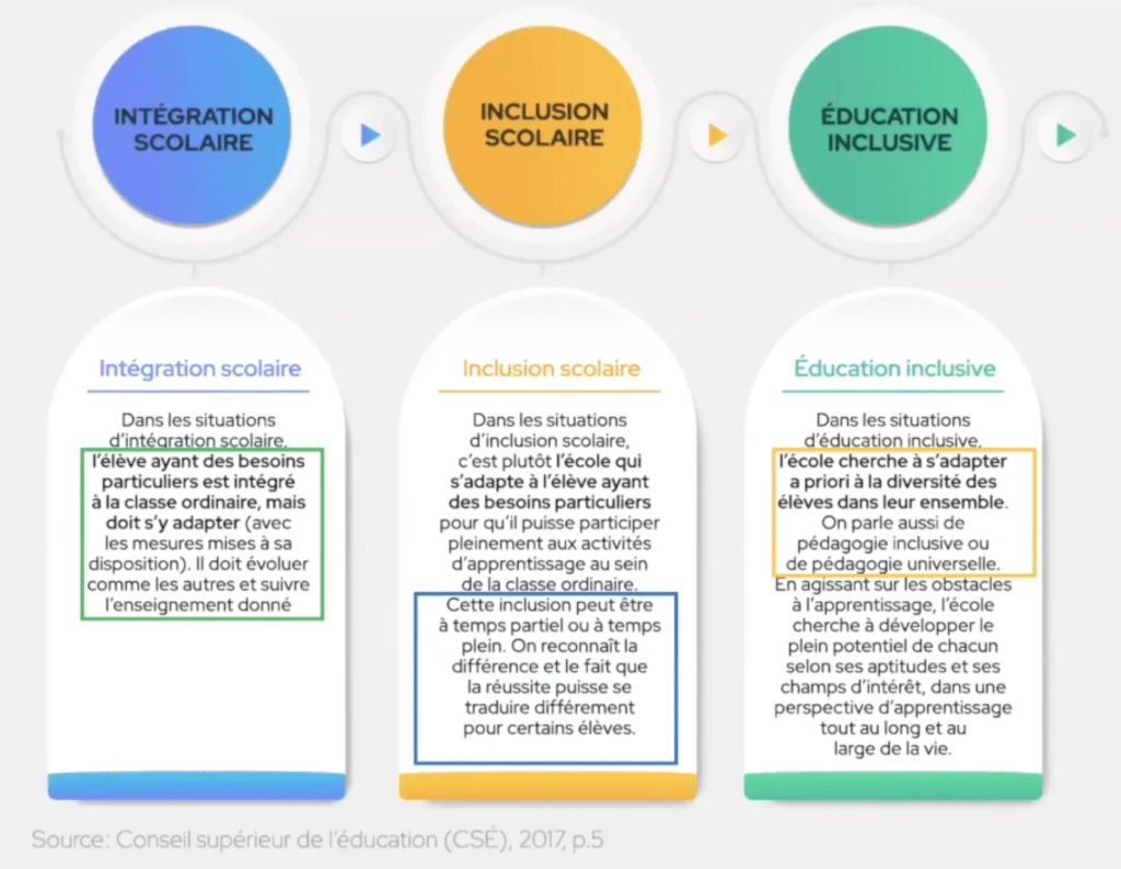 Un intérêt de cette infographie est de distinguer l’inclusion scolaire avec l’éducation inclusive, ce qui est la tendance actuellement recherchée. La CUA est là, dans la dernière colonne en vert. On est au-delà d’être en mesure de participer aux activités d’apprentissage : c’est une mission plus large, de dimension sociétale.