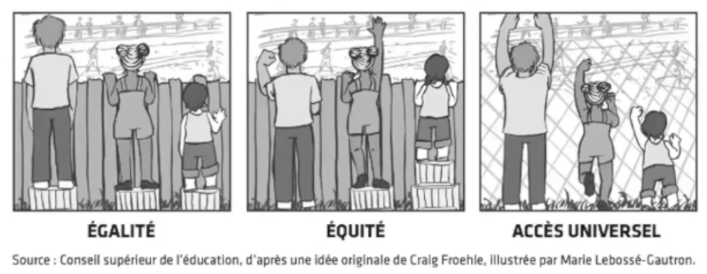 Au-delà de ce que montre ce dessin, l’accès universel vise la participation des personnes et non seulement le fait d’assister à quelque chose.