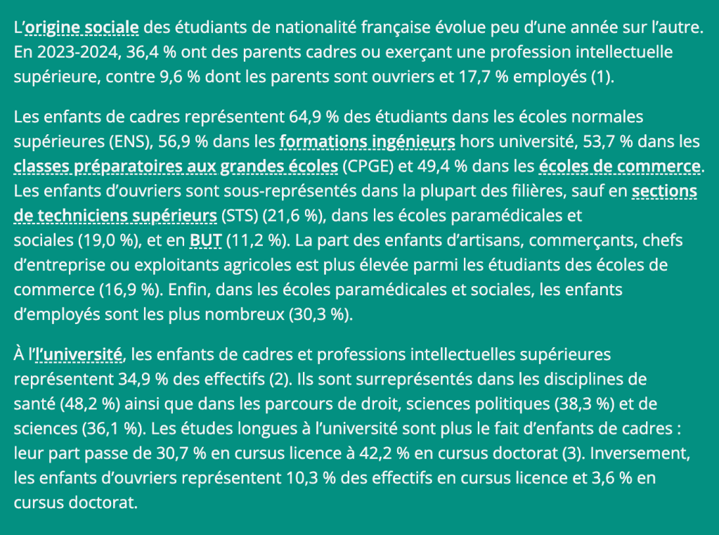 La science a ainsi contribué à renforcer les écarts. Qu’en est-il aujourd’hui ? Un rapport intitulé « Quelle démocratisation des grandes écoles depuis le milieu des années 2000 ? », publié par l’Institut des politiques publiques (IPP) en janvier 2021 indiquait qu’en 2017 les étudiants des grandes écoles n’étaient que 9 % à être issus de catégories socioprofessionnelles défavorisées, comprenant les ouvriers et les personnes sans activité professionnelle, alors qu’ils représentaient plus d’un tiers de l’ensemble des jeunes de 20 à 24 ans. Dans les 10 % d’écoles les plus sélectives, les enfants d’ouvriers ou de chômeurs étaient deux fois moins nombreux (5 %). Quant aux enfants d’employés, d’agriculteurs, d’artisans ou de commerçants, ils constituaient 18 % des effectifs des grandes écoles contre 27 % des jeunes de 20 à 24 ans. Même si ces statistiques datent un peu, la situation actuelle n’est pas arrivée à un équilibre.