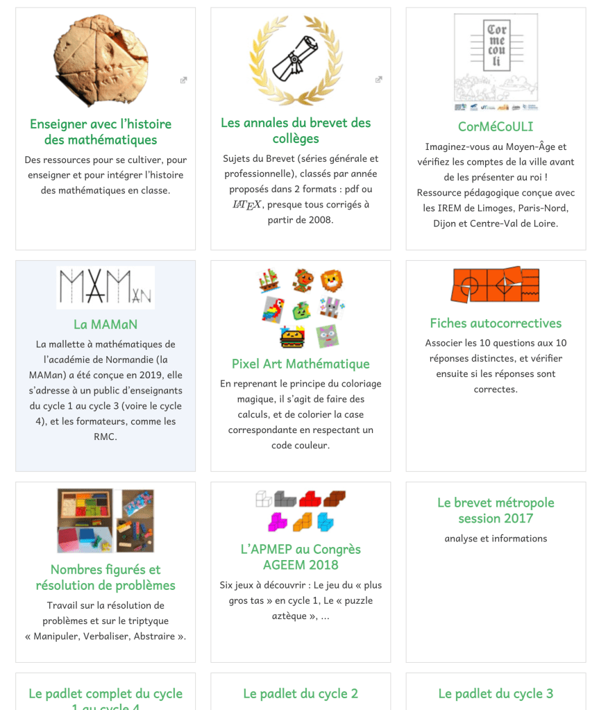 La MaMaN avait été mise en ligne sur un espace Tribu, accessible à toutes et tous. Cet espace a fermé et les contenus étaient invisibles. Mais voilà : l’APMEP est là, qui les a publiés sur son site. Peut-être prochainement seront-ils aussi en ligne sur le site des mathématiques de l’académie de Normandie.