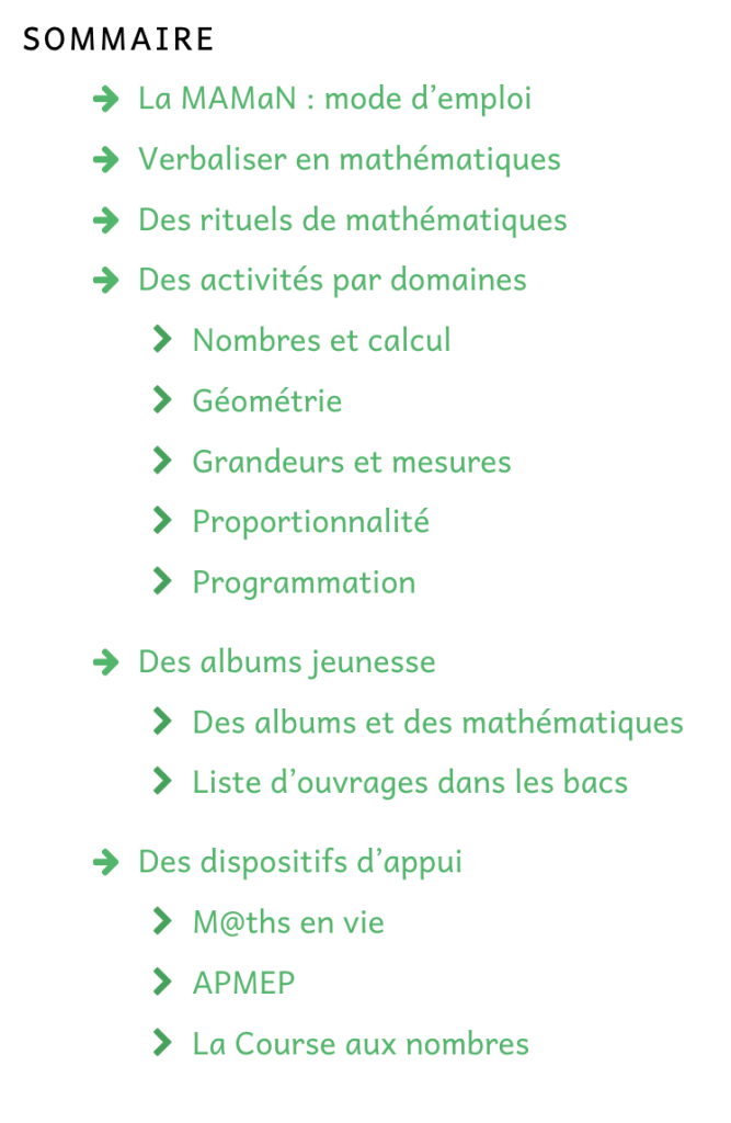 Dans la MaMaN, vous ne trouverez que des outils pour la classe : des fiches de mise en oeuvre d’activités, assorties de toutes les références, les éléments didactiques et les documents d’appui nécessaires, des pages et des pages de matériel pour proposer des rituels efficaces, qui développent les automatismes indispensables pour libérer de l’espace mental pour réfléchir, des propositions de scénarios pédagogiques pour utiliser des albums jeunesse dans le cadre d’apprentissages mathématiques, et quelques autres focales développées par ailleurs.