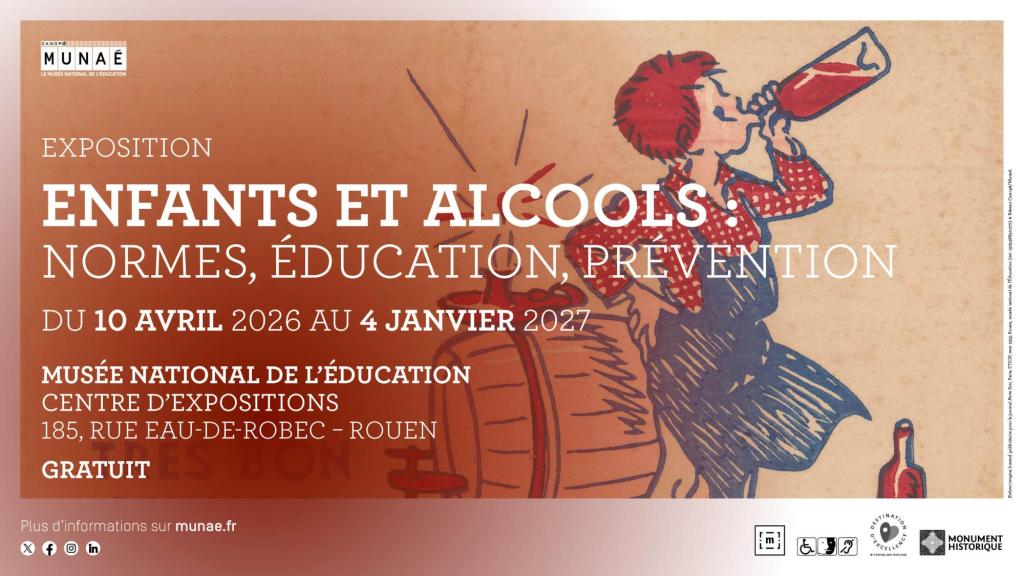 La nouvelle exposition temporaire du Musée National de l’Éducation (le Munaé à Rouen), s’est ouverte le 10 avril 2026 et est visible jusqu’au 3 janvier 2027. Elle s’intitule : Enfants et alcools : normes, éducation, prévention. Avec mon mari, nous avons fêté notre premier jour des vacances de printemps en allant la visiter (hé non, nous ne faisons pas semblant d’être profs… 🙃 ), et nous avons bénéficié d’une visite guidée par Kristell Gilbert..