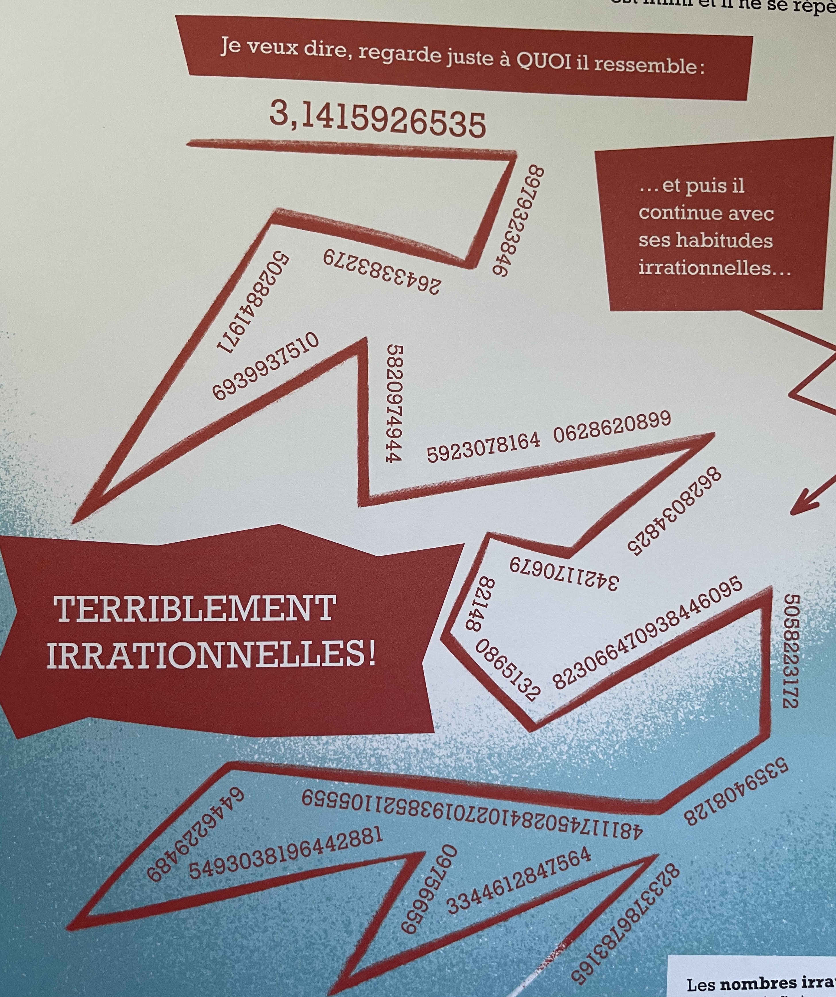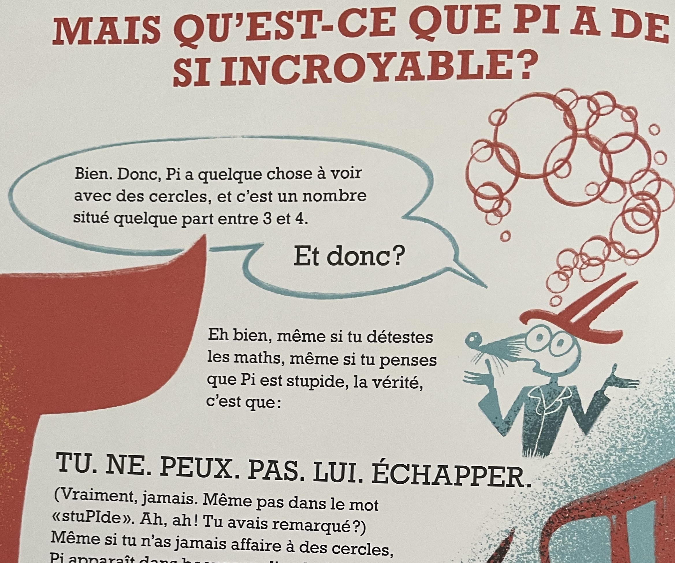 Plongée dans l’enseignement spécialisé et la lutte contre la vulnérabilité scolaire, je m’étais un peu éloignée des lectures mathématiques. Mais comme je suis en vacances et que cette fois je m’applique à ne pas faire que travailler, je me suis posée dans mon fauteuil préféré et j’ai attrapé un des ouvrages qui m’attendent depuis des mois. C’est L’univers de pi qui a été le premier, et découvrir ce livre a été un vrai bonheur : il est drôle, intéressant, part dans tous les sens en respectant une colonne vertébrale identifiable, est illustré de façon très sympa… C’est un vrai beau boulot !