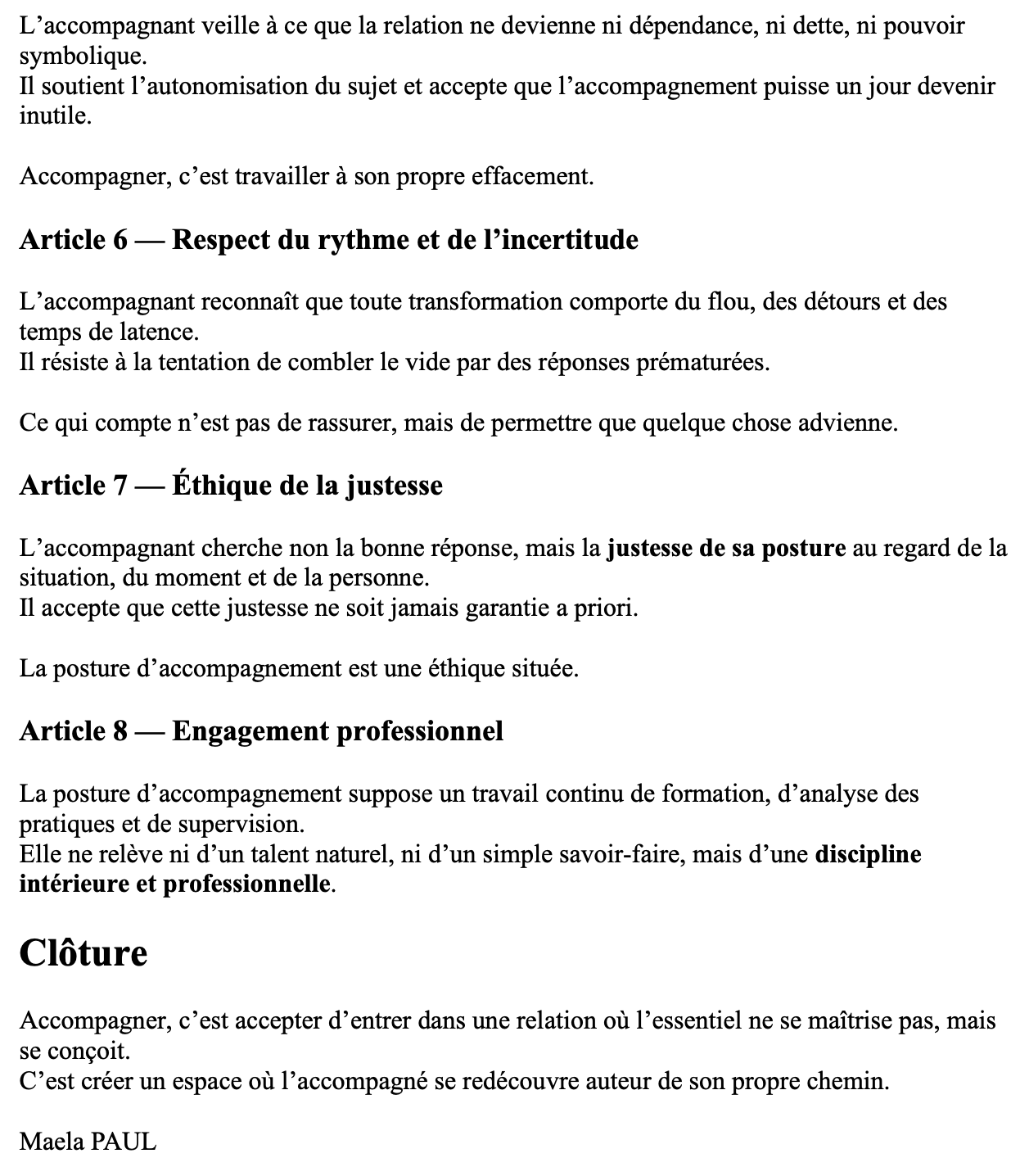 Dans la foulée, elle publie une charte « ajustée à la posture d’accompagnement, parce qu’elle dit à la fois un engagement, une éthique en acte et des repères non prescriptifs ».