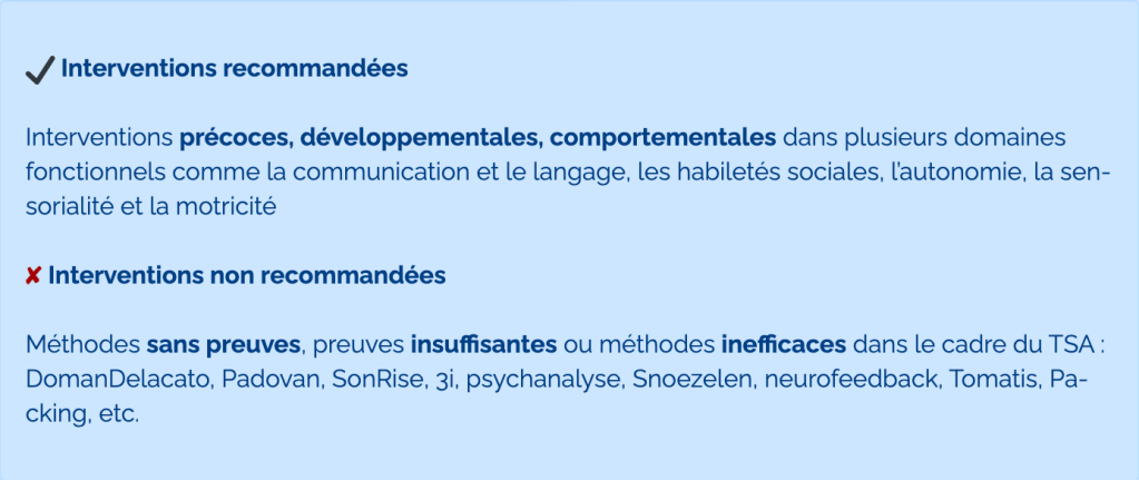 En l’absence de traitement médicamenteux ou biomédical spécifique à l’autisme, toute prescription, en particulier de psychotropes, doit être strictement encadrée, faire l’objet d’une information préalable des familles, être précédée d’un bilan initial et s’accompagner d’une surveillance régulière, conduite en lien étroit avec l’enfant ou adolescent autiste, sa famille et les professionnels impliqués dans son accompagnement.